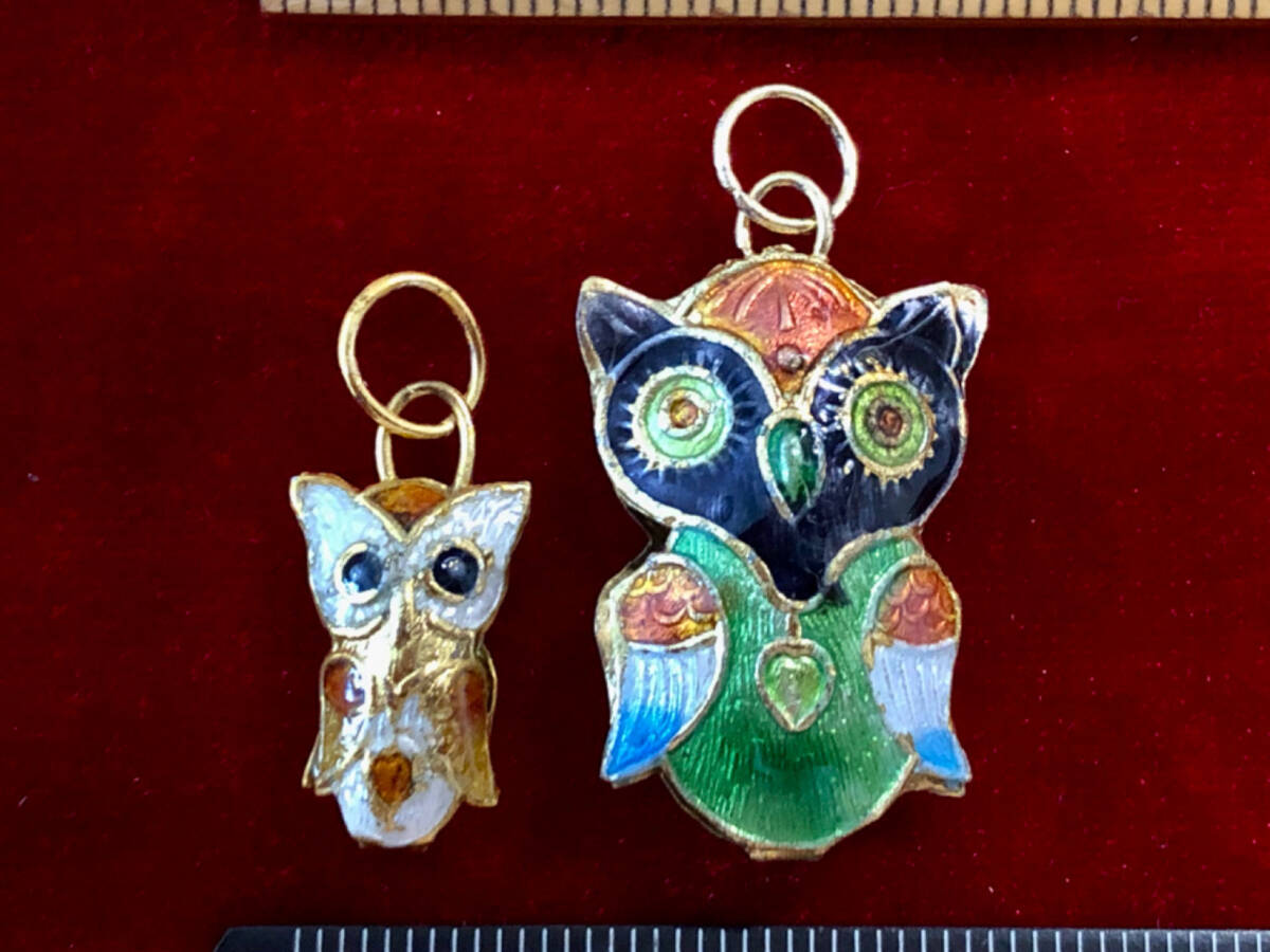 - ¶!¶ 有線七宝焼ワールド - ペア(大小各1)のフクロウ不苦労で1単位 ¶!¶ 金線に緑黒釉橙白色羽 手作り 手芸 工芸 インテリア 趣味