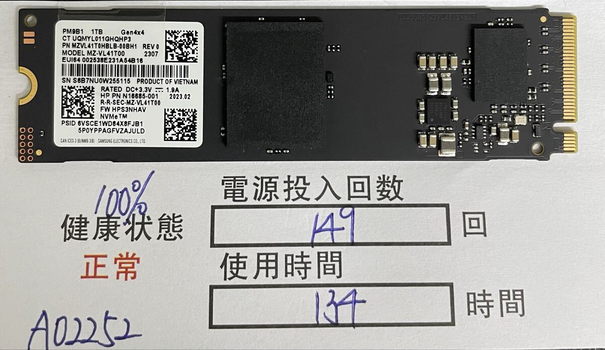 > A02252/中古品/SSD/NVME/2280/Samsung/1TB /動作確認済み/返品返金対応/納品書発行可(商品説明文ご確認下さい)