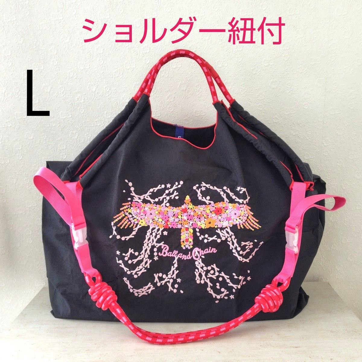 - 【新作】L 刺繍 エコバッグ ストラップ付 花柄 鳥 ソフトバンク 黒 ブラック