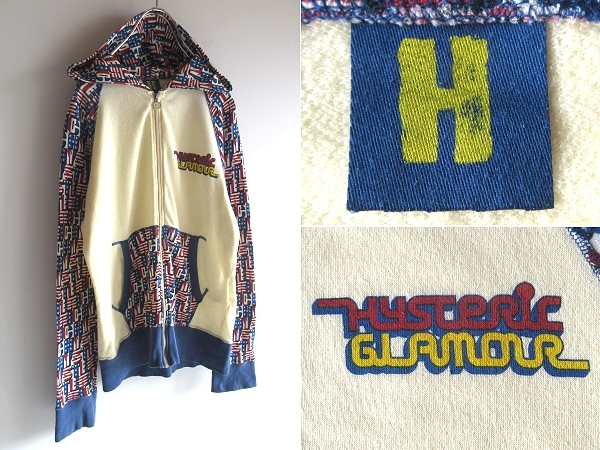 > 希少 00sビンテージ HYSTERIC GLAMOUR ヒステリックグラマー 星条旗ロゴモノグラム切替 ロゴプリント ライトスウェット ジップパーカー F