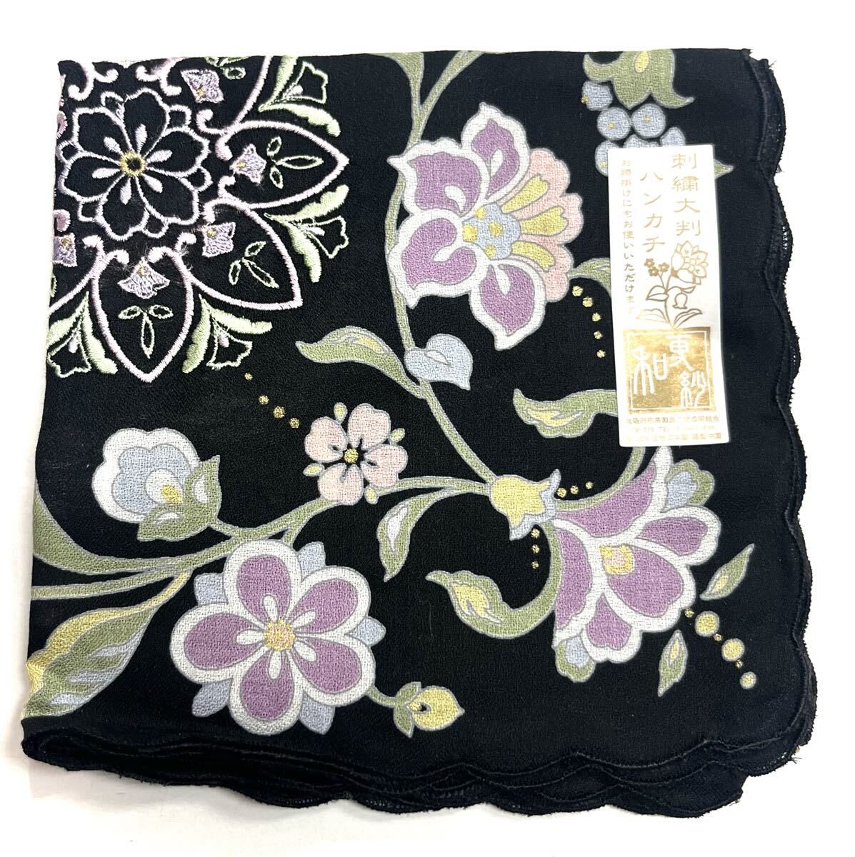 - 和更紗★綿100% 花柄 刺繍大判 ハンカチ