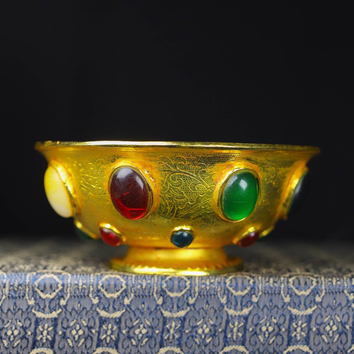 - 蔵友旧蔵出 銅製 塗金 寶石嵌 供碗 希少珍品 貴重品 置物 古賞物 密宗密教 供養品 仏教美術品