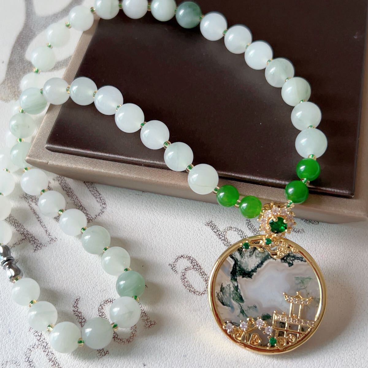 > ◇天山翠+台湾碧玉+水草瑪瑙◇ネックレスト◇ペンダント(水草瑪瑙)◇パワーストーン◇天然石◇巾着袋付030P91112