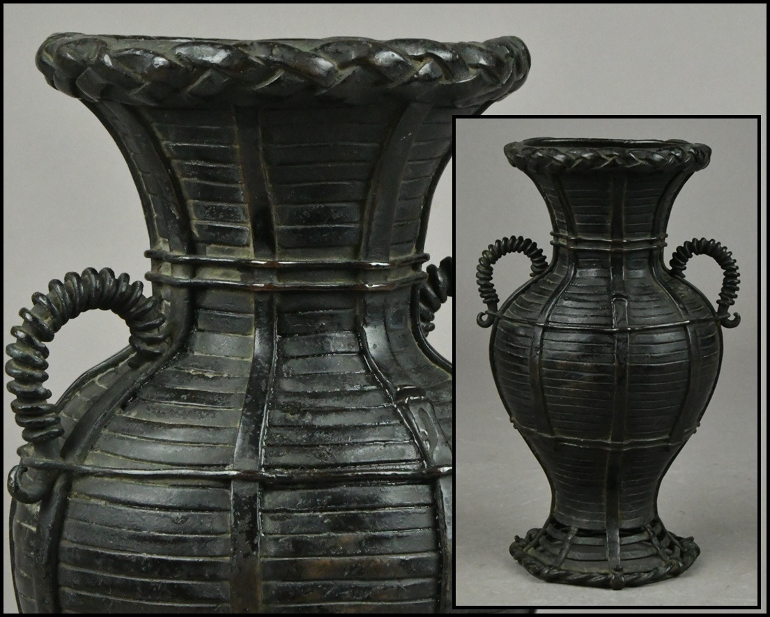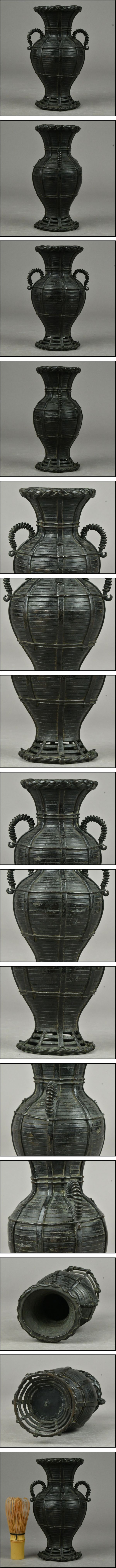 - 【NNK】時代物 古銅 銅製 竹網細工 耳付花瓶 花入 古美術品 高さ18cm U7-908-4