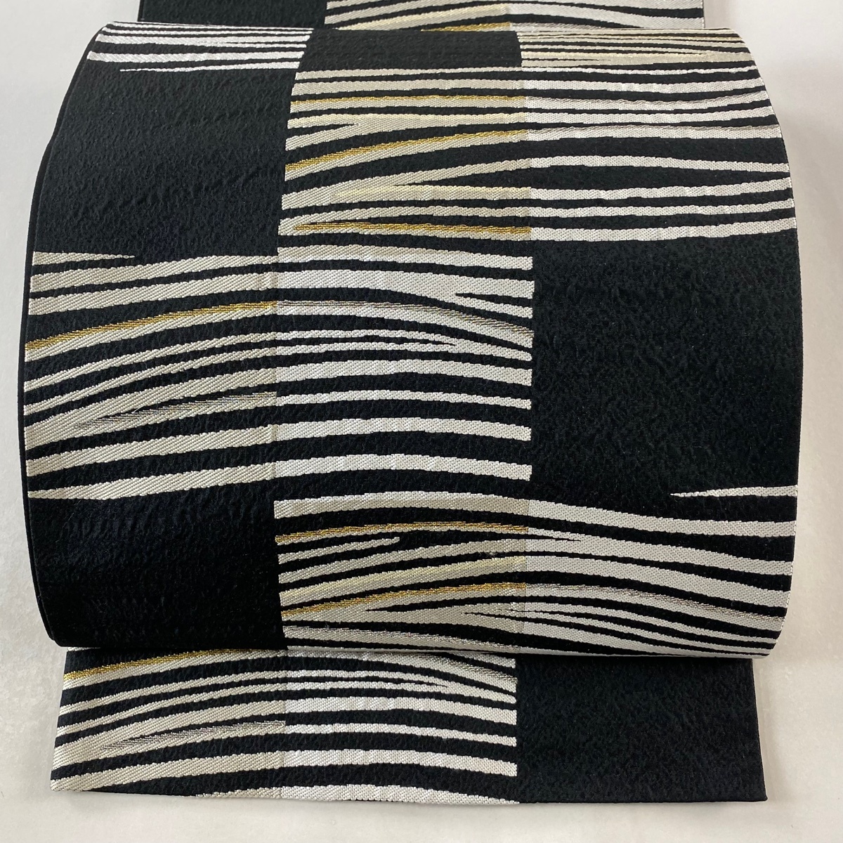 > 袋帯 美品 秀品 変わり市松 幾何学模様 金銀糸 黒 六通 正絹 【中古】