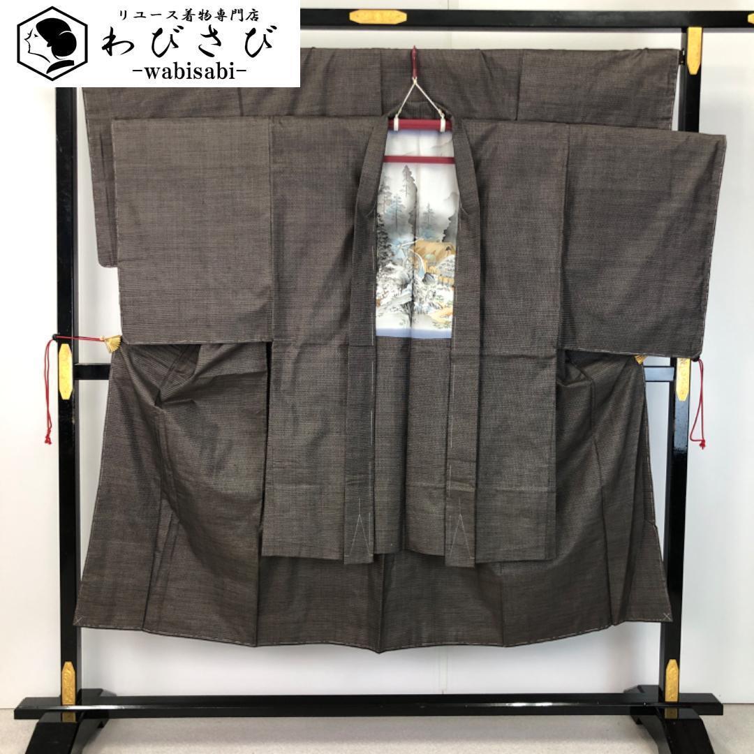 - 男着物 アンサンブル 大島紬 100亀甲 涅色 しつけ糸 M-1116 着物 きもの kimono 和服 和装 中古 リサイクル着物 【送料無料】