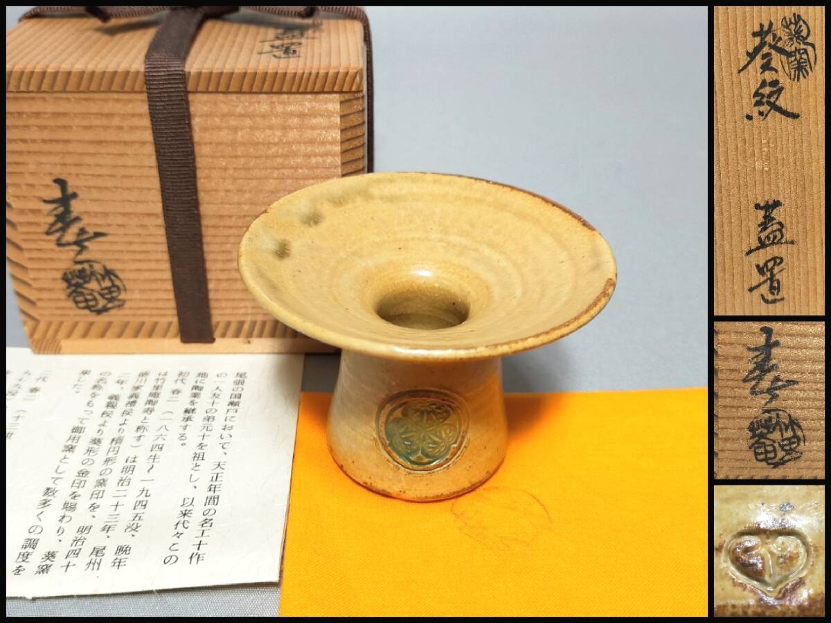 - FE27 瀬戸焼 蓋置 葵窯 三代 加藤春二 造 黄瀬戸 葵紋 栞・共布・共箱 茶道具