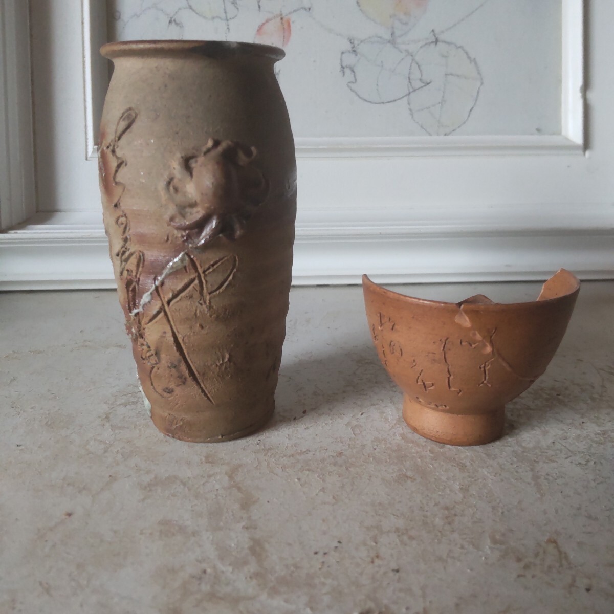- 骨董品欠け置物アンティーク古い文字古備前蛸壺割れ猪口 在銘