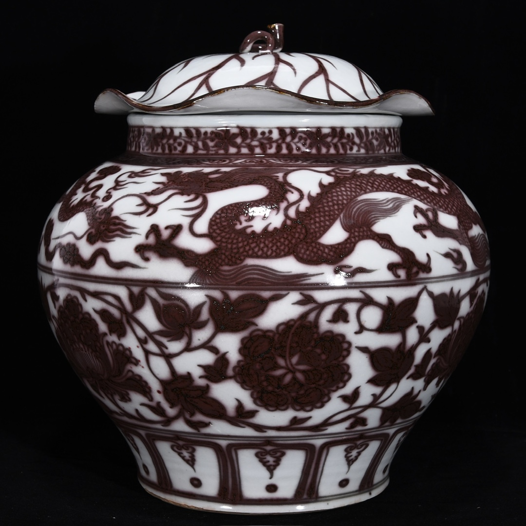 > 9_ZZ8968【惠】人間国宝 中国骨董 陶芸 磁器【元釉里紅竜紋蓮の葉蓋壺】工芸品 施釉陶 青花磁 陶芸 置物 收藏品