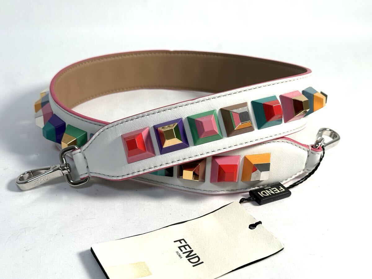 > 881 未使用保管品 フェンディ ストラップユー ロング ショルダーストラップ アクセサリー スタッズ レザー ホワイト マルチカラー FENDI