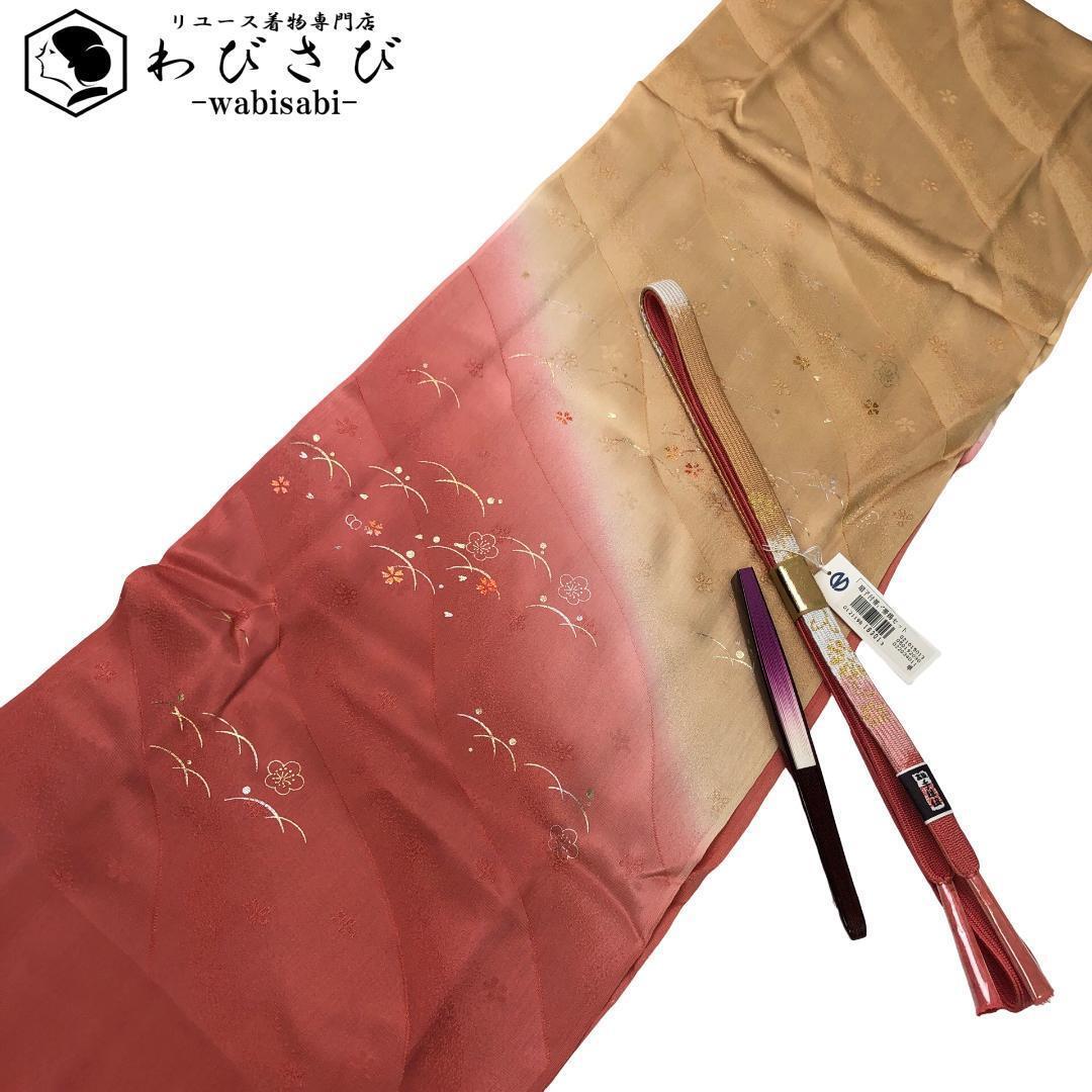 海老赤色ベースのお色味に露芝に花模様の帯揚げ、高麗組の素敵なお品でございます。