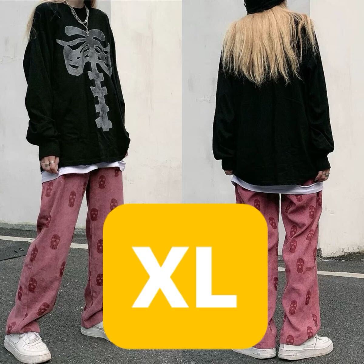 - ワイドパンツ ボトムス ストレートパンツ ドクロ柄 パンツ メンズ レディース ワイドレッグパンツ #ピンク #ぴんく #XL