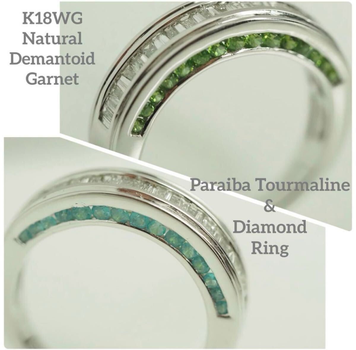 - K18WG 天然パライバトルマリン&デマントイドガーネット&ダイヤリング 鑑別書