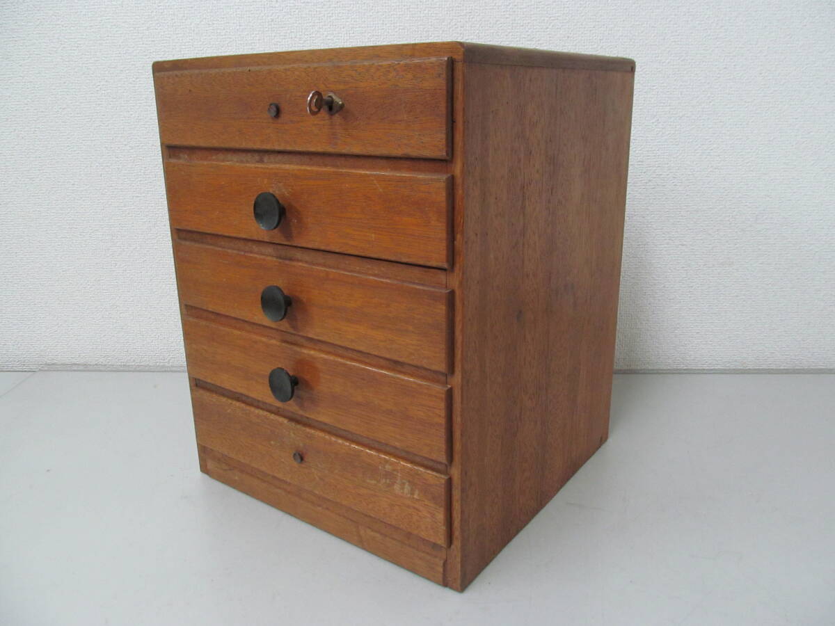 - 古い 木製 5段 小引き出し 鍵付き 小物入れ 収納 小箪笥 古道具 アンティーク レトロ