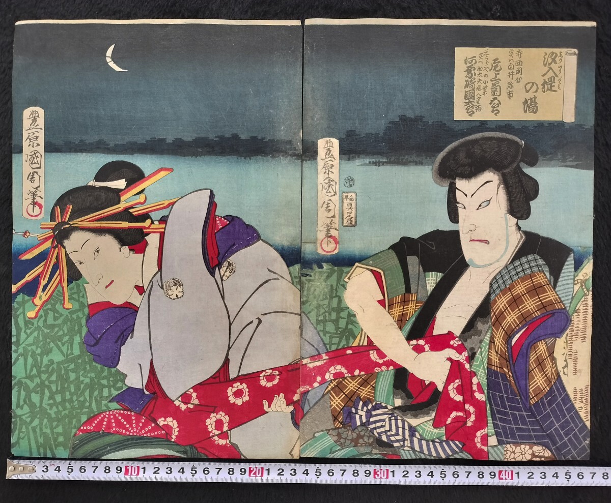 > 江戸期/真作 豊原国周「汐入堤の場」本物浮世絵木版画 役者絵 歌舞伎絵 芝居絵 錦絵 大判 二枚続き 裏打ち 保存良い
