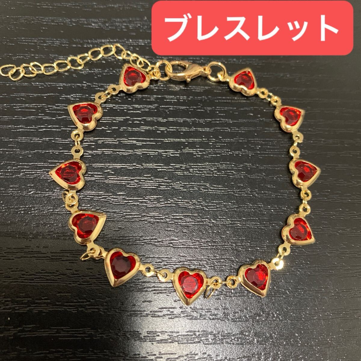 - 病み可愛い 地雷系 ダークレッド ハート ストーン ブレスレット ゴールド