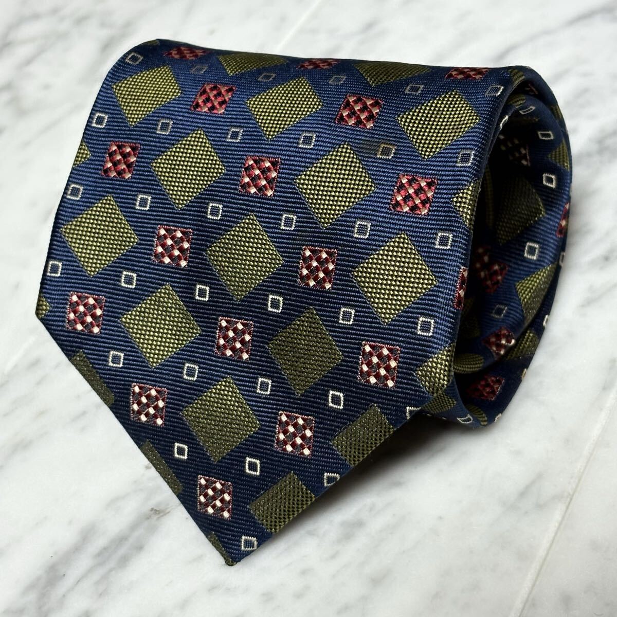 - 【美品】 999円~ ジュンアシダ ネクタイ ネイビー グリーン パターン柄 (B5)