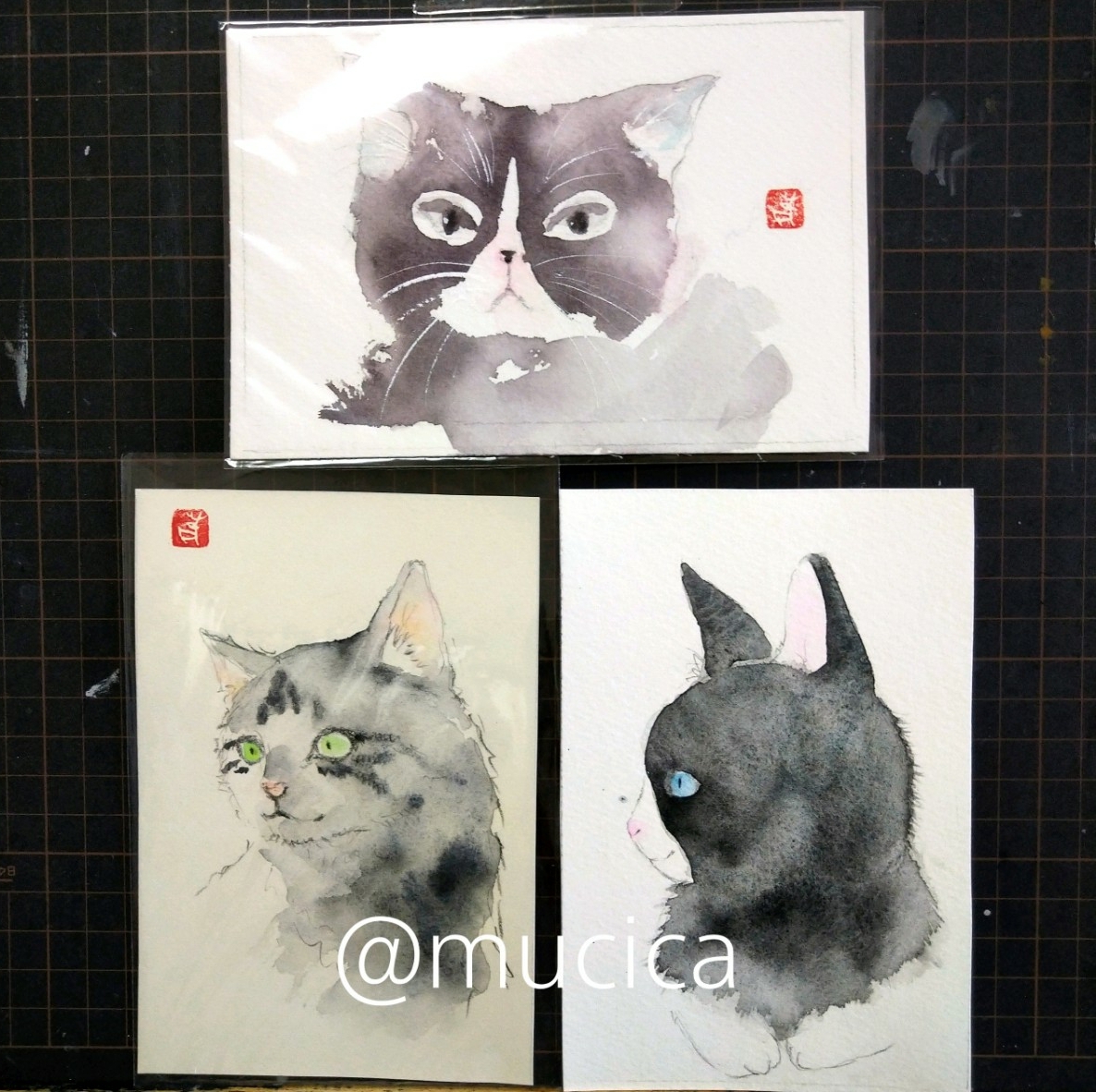 - 肉筆原画 水彩画 美人画 ドローイング 絵画 手描きイラスト 3枚セット ネコ 動物 Animal 猫 Cats A6