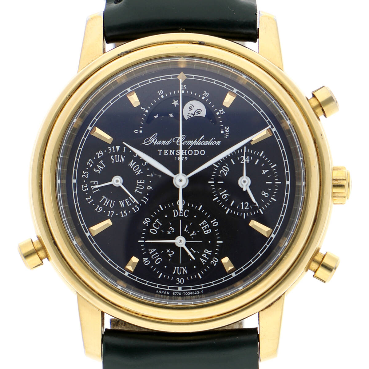 - 天賞堂 6770-T004245TA グランドコンプリケーション ブラックダイヤル GP/レザー クオーツ メンズ【134988】