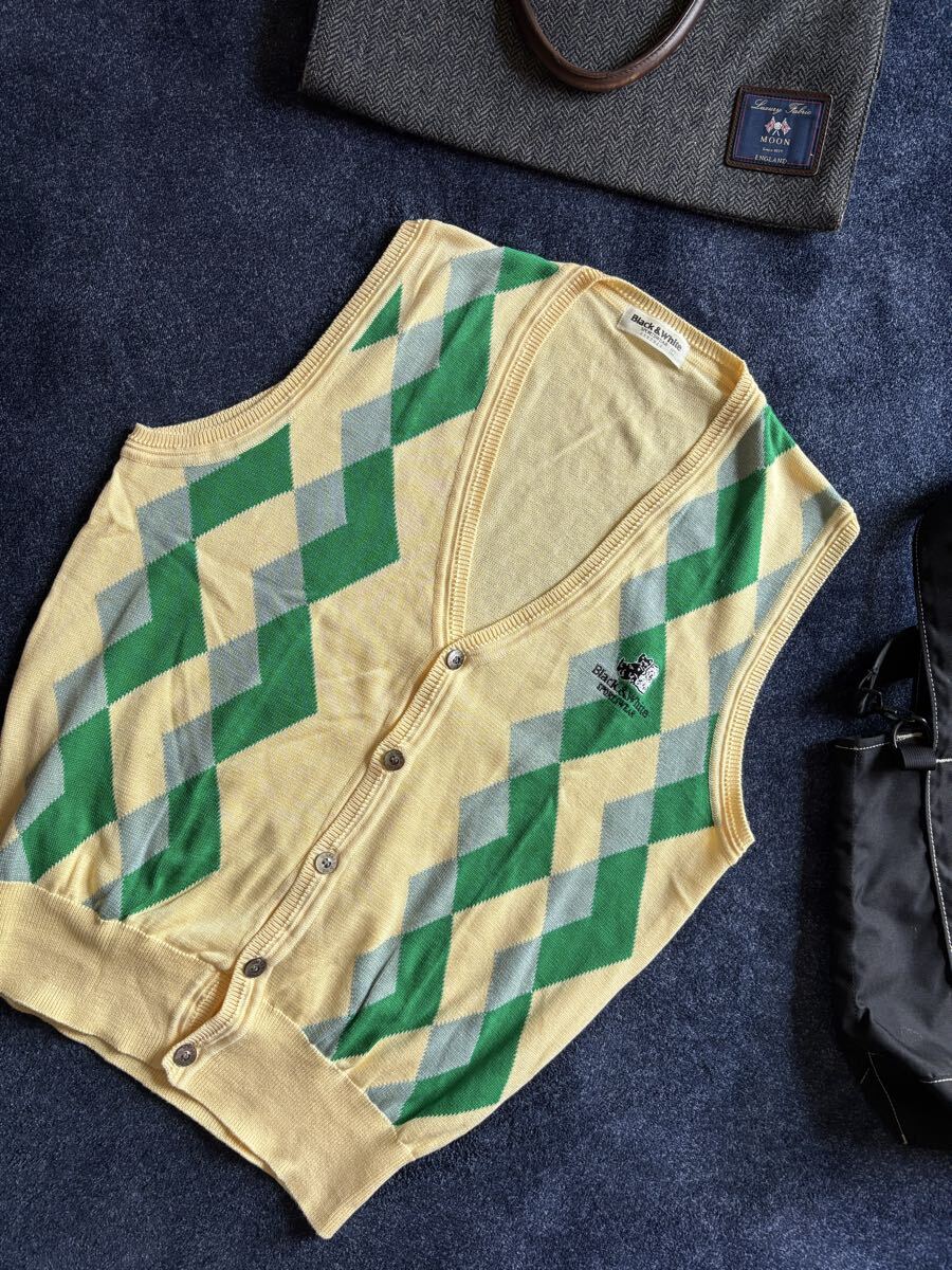 > 新品 定価15,400円 Black&White ブラック&ホワイト 高品質コットンニット素材 アーガイル調 Ⅴネック ベスト sizeL イエロー系