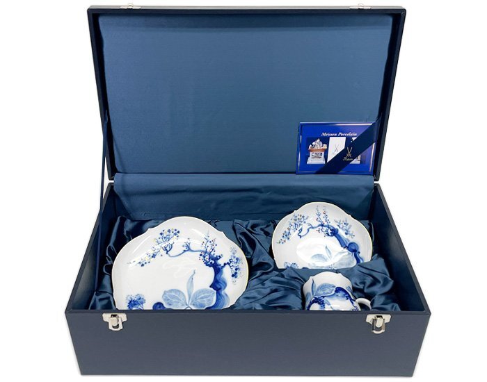 - 未使用 Meissen マイセン ブルーオーキッド カップ ソーサー プレート 1客セット 2001年 限定 モーニングセット 金彩 金縁 西洋磁器 箱付