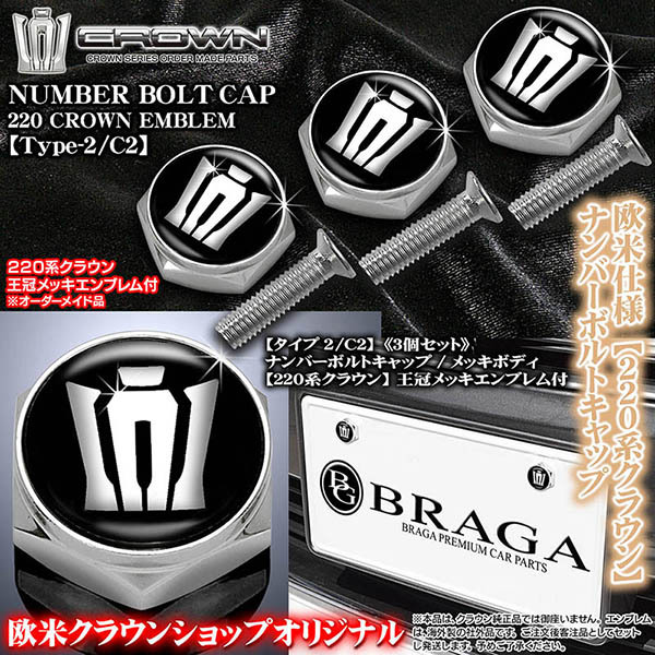 - 新型クラウン欧米仕様/220系クラウン エンブレム付/メッキボディ/ナンバーボルトキャップ/タイプ2・C2/3個セット/互換品/ブラガ