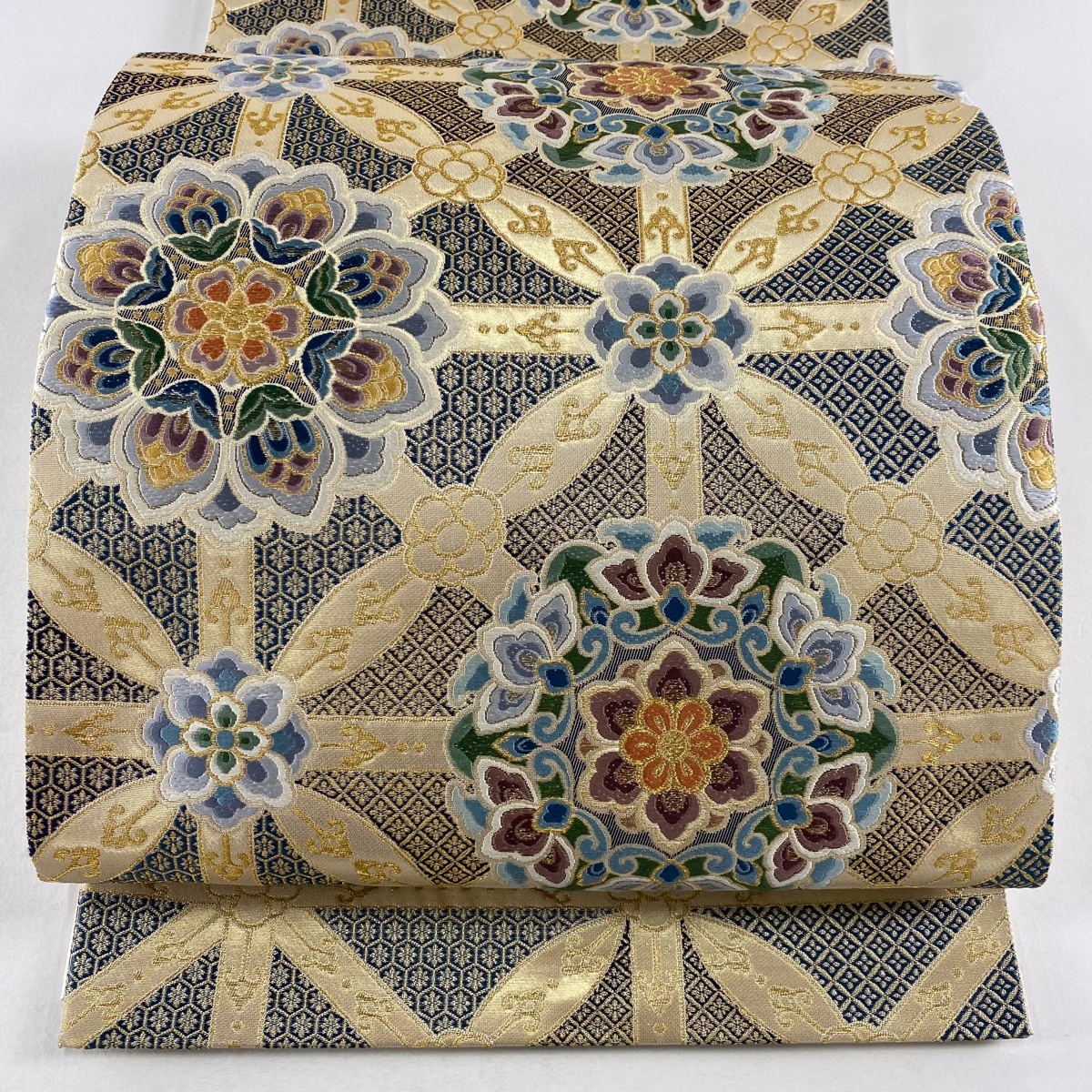 - 袋帯 美品 秀品 平等院宝珠華文 箔 金糸 ベージュ 六通 正絹 【中古】