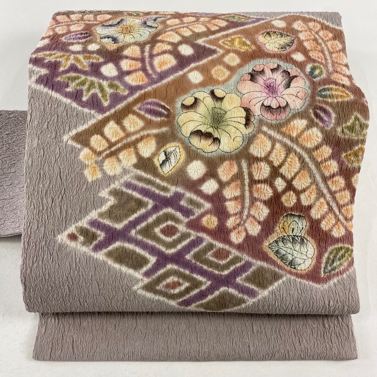 - 名古屋帯 美品 名品 椿 松皮菱 絞り 灰紫 正絹 【中古】