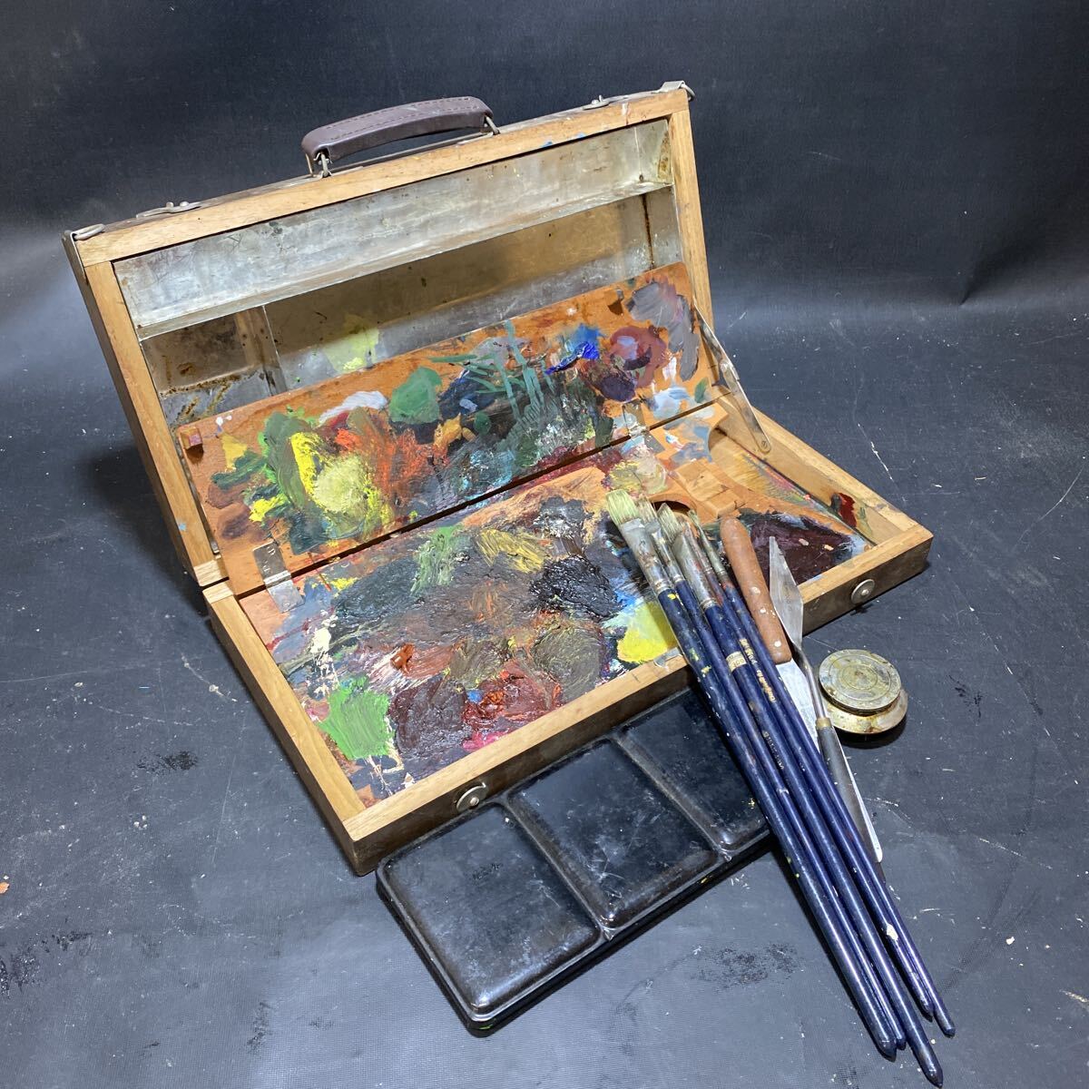 - N 6565 [ 油絵具セット 木製ケース付き ] 油絵 絵描き 道具 筆 パレット 中古品 画材 油絵セット 油絵 中古品 現状品 昭和レトロ