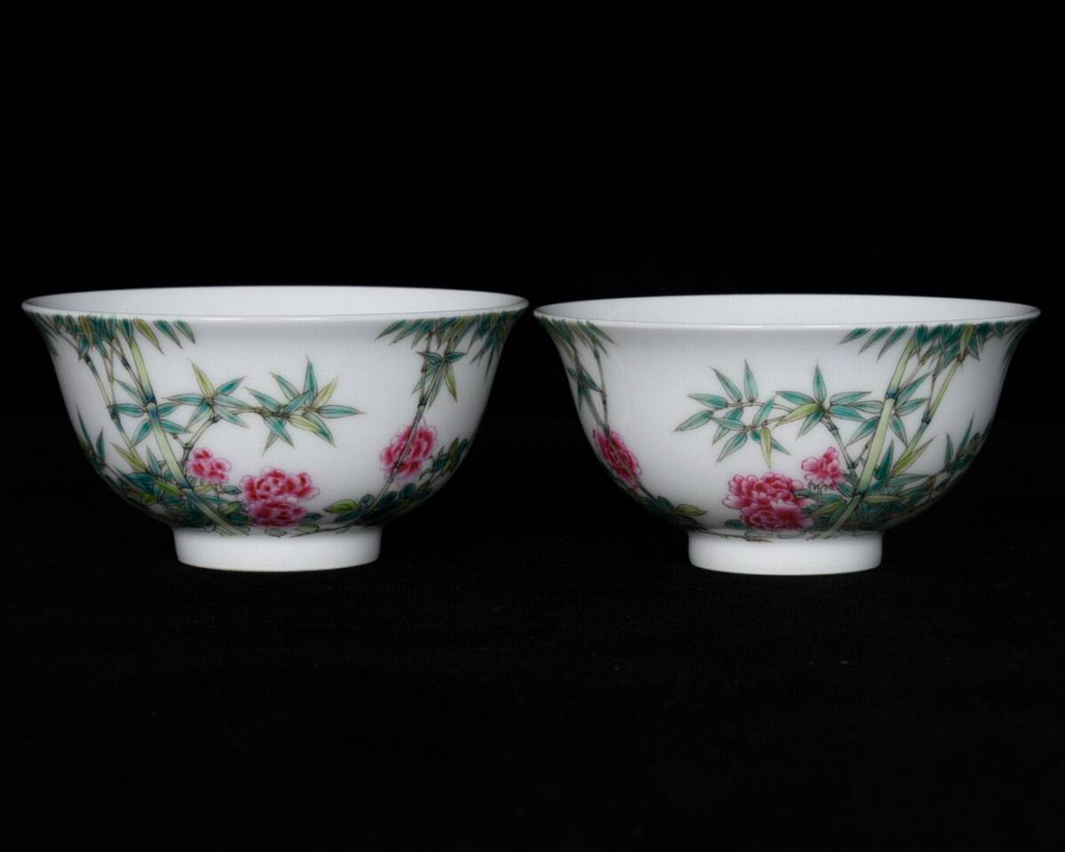 > 【仁】『清・雍正年製款・古陶瓷品・琺瑯彩・竹子花卉紋・供碗一對・陶藝』極細工 古董品 中国古玩 古美術 古美味 時代物 旧家蔵出