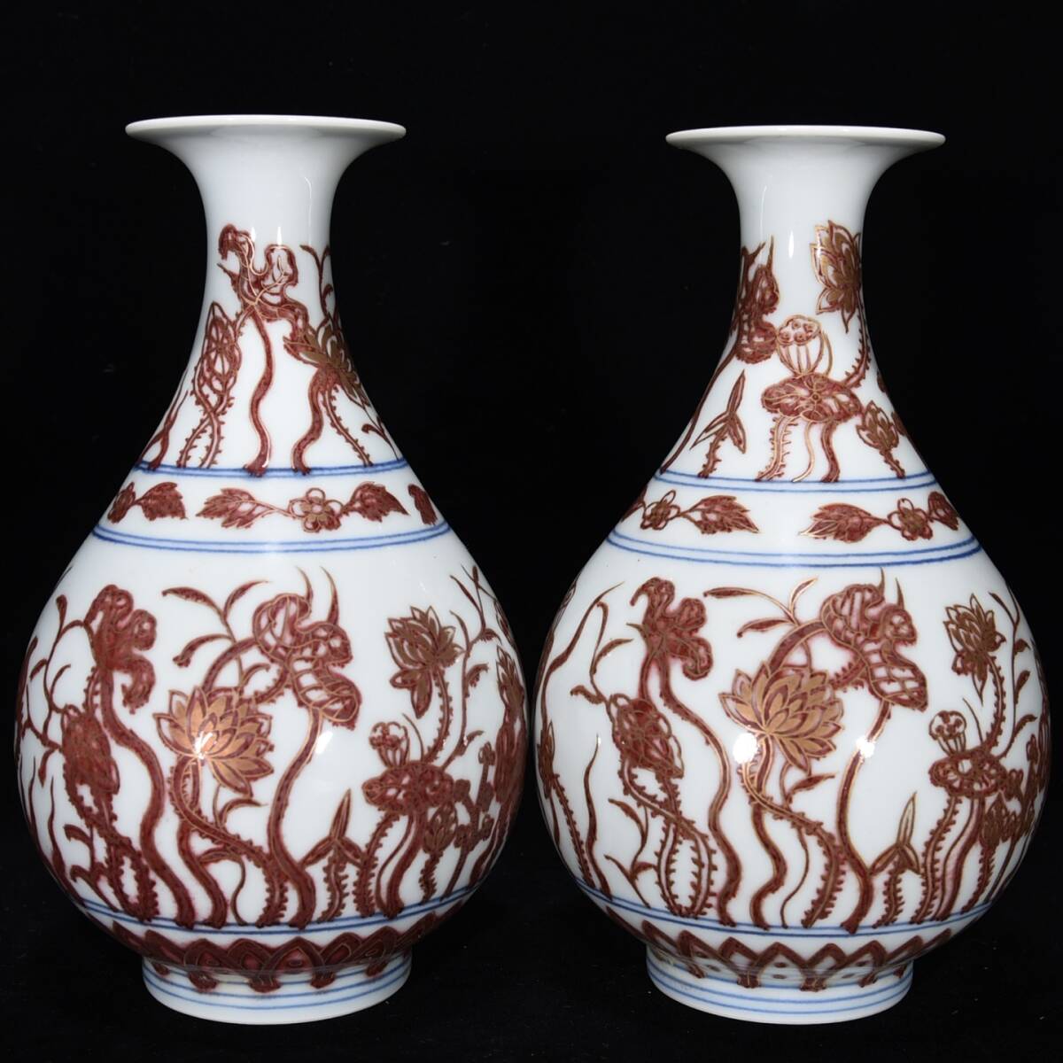 > LM113■古玩 陶芸 磁器『明成化釉里紅描金荷塘月色紋玉壺春瓶一対』古代工芸品 陶芸 精美彫 置物■高さ21.6cm直径12.5cm■