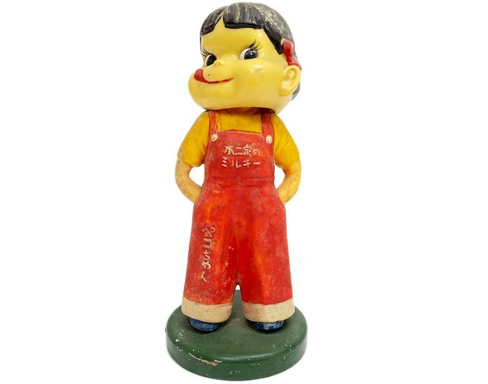 > 不二家 フジヤ ミルキー ペコちゃん 首振り 人形 フィギュア ソフビ ソフトビニール 木製台座 当時物 昭和レトロ 昭和玩具 ヴィンテージ