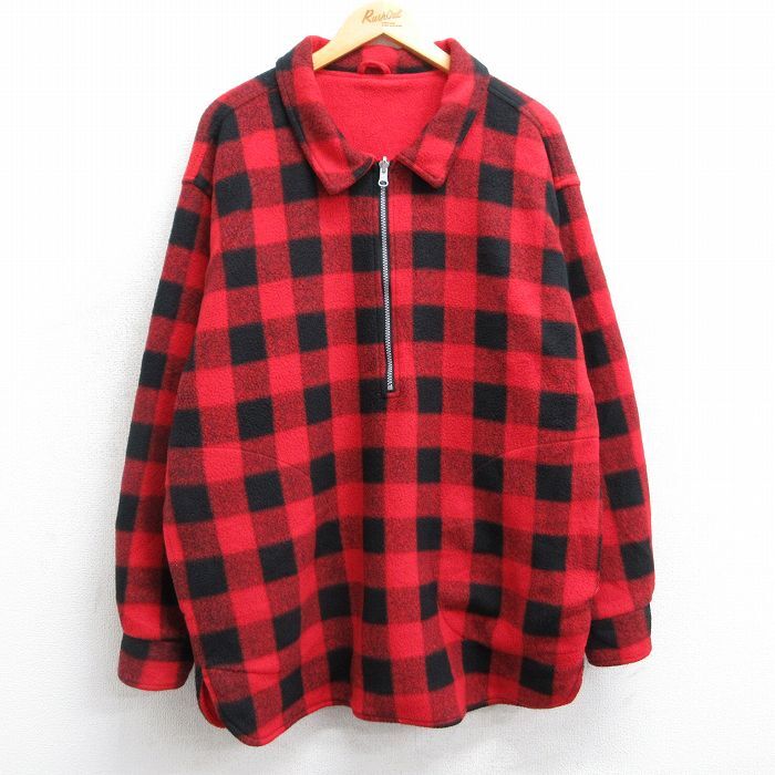 - L/古着 マルボロ 長袖 ハーフジップ フリース ジャケット メンズ 90s リバーシブル ロング丈 赤他 レッド バッファロー チェ