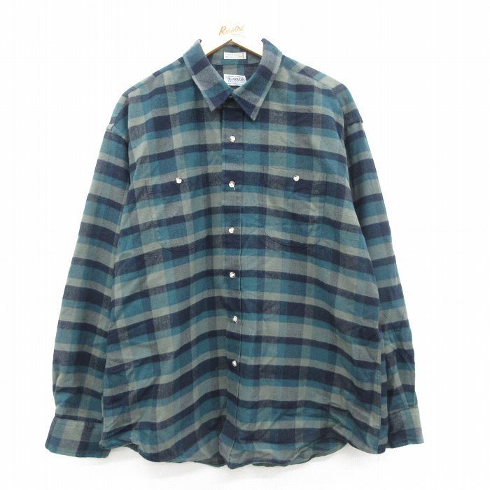 > XL/古着 長袖 シャツ メンズ 90s ロング丈 紺他 ネイビー チェック 24sep26 中古 トップス
