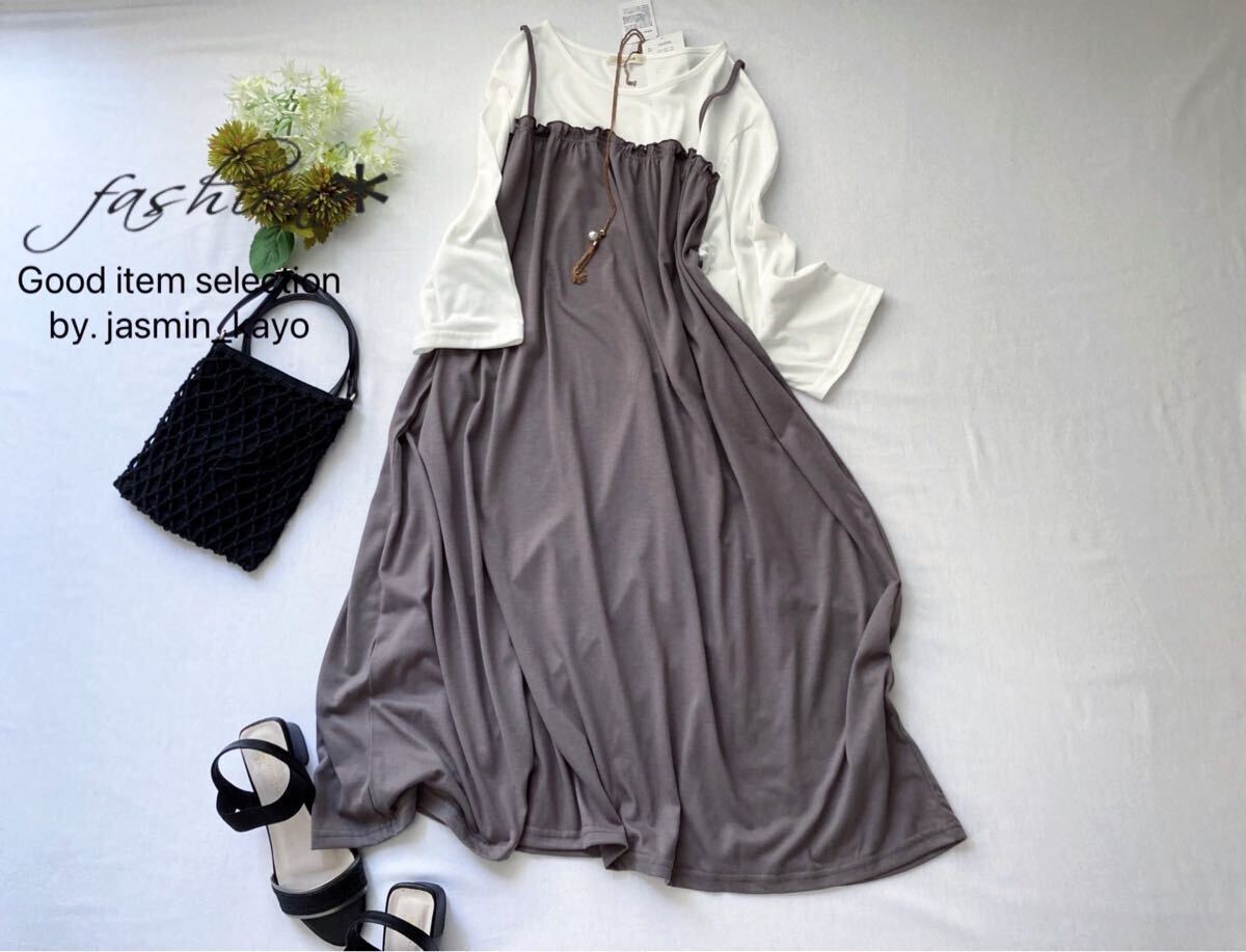 - ◆新品4L~3L/LL◆胸前後シャーリングミニフリル♪綿混グレージュカラーロングキャミと可愛いレイヤードチュニック*七分袖