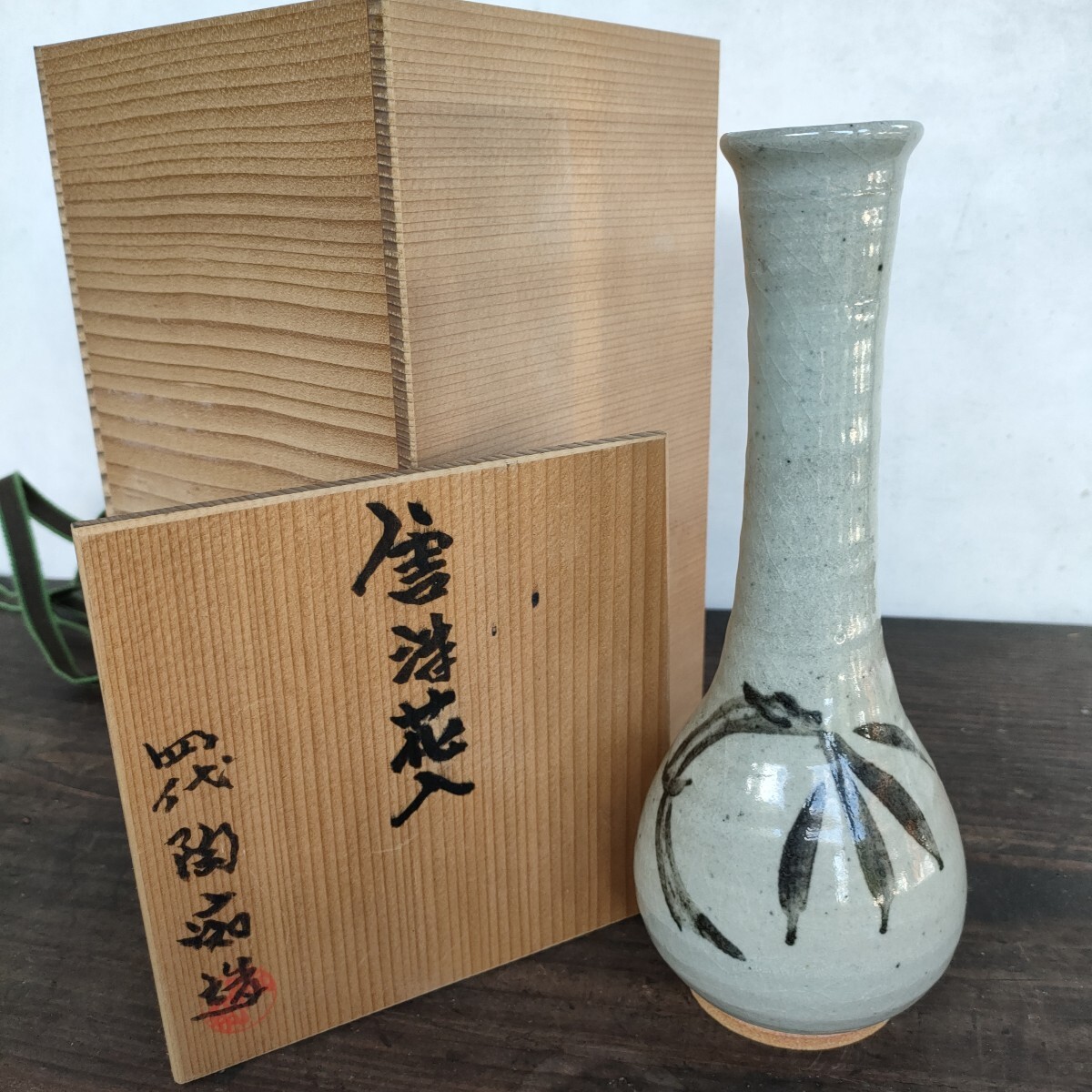 - 難あり 水漏れします 四代 中野陶痴 唐津焼 花器 花瓶 花入 一輪生 共箱あり 1000円スタート