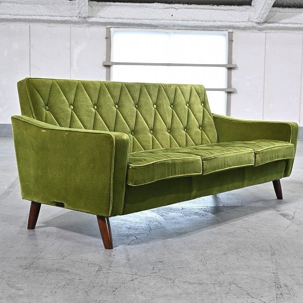 - カリモク60 17万「ロビーチェア3シーター」ブナ無垢材 モケットグリーン トリプルソファ 3人掛け リビング karimoku レトロ調