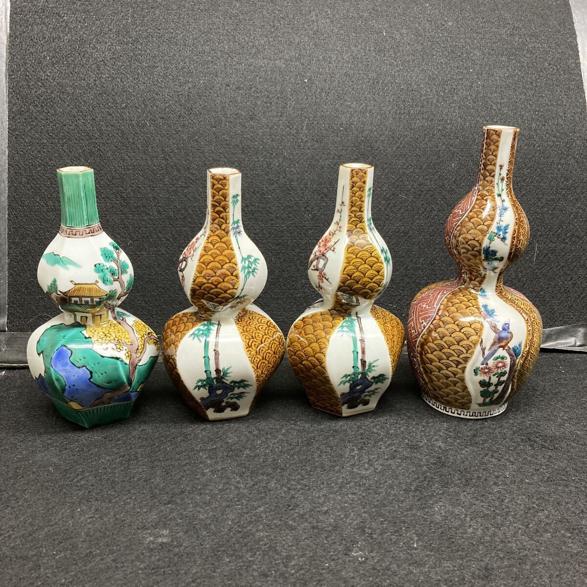 - 九谷焼き 初代三井為吉造(物故家) ★瓢箪形 松竹梅絵 徳利 一対 ★瓢箪形 山水絵 徳利 四本組 ★瓢箪形 花鳥絵 大徳利
