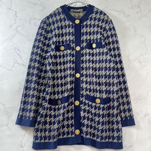 - 【L】 美品 ジバンシィ 金ラメニットカーディガン セーター 金ボタン 千鳥格子 ロング 総柄 ゴールド ネイビー レディース GIVENCHY B1485
