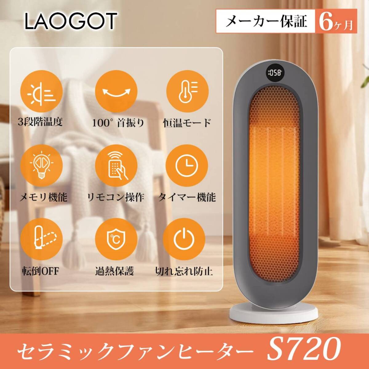 - 温風3段階調節 リモコン付き 大風量セラミックヒーター