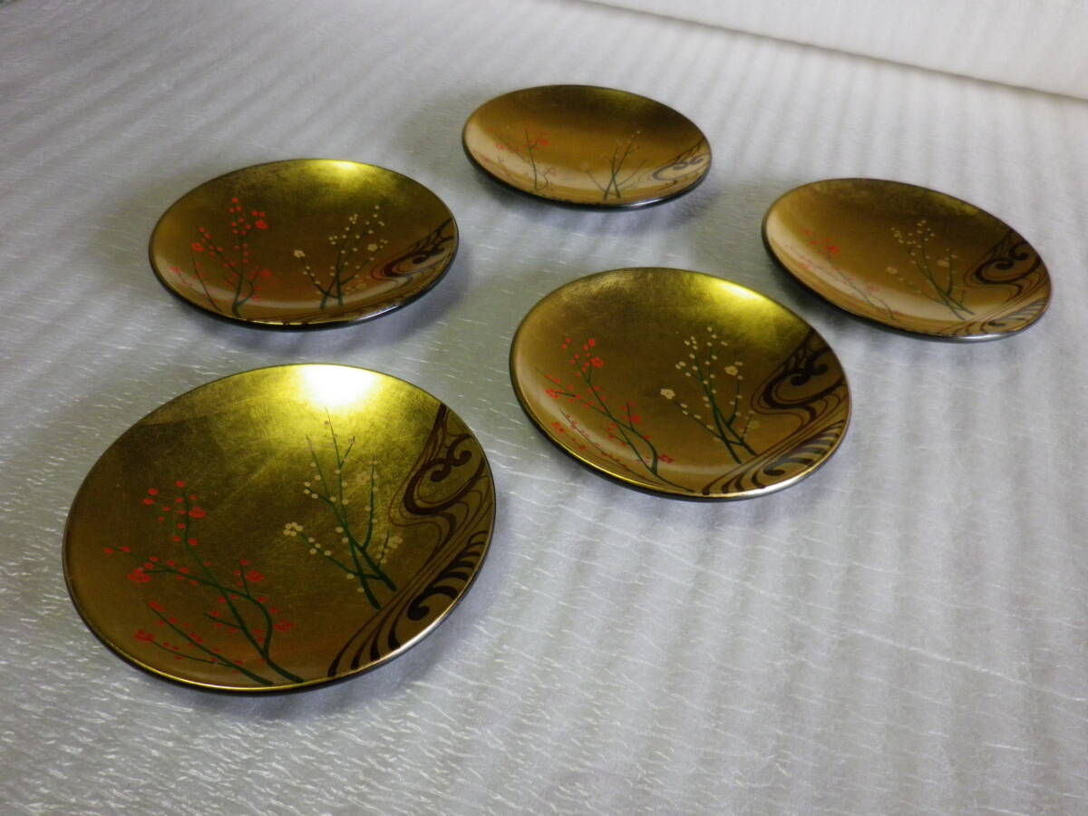 - 漆器 金蒔絵銘々皿 紅白梅金蒔絵 5枚 未使用長期保管品