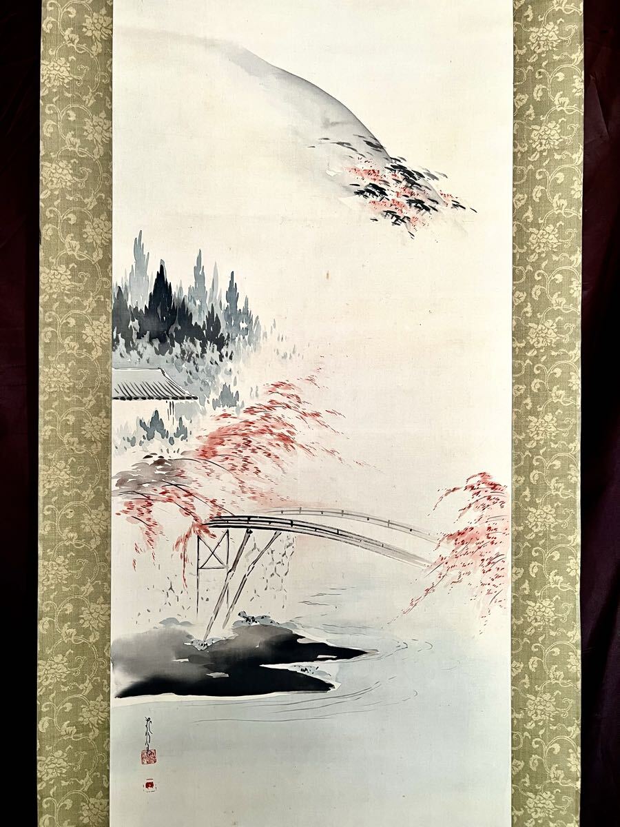 【真作】【S8】橋本花乃「高雄紅葉図」絹本 肉筆 共箱 秋景 風景画 山水図 絵画 掛軸 明治-昭和期の女流日本画家 大阪の人 師: 北野恒富