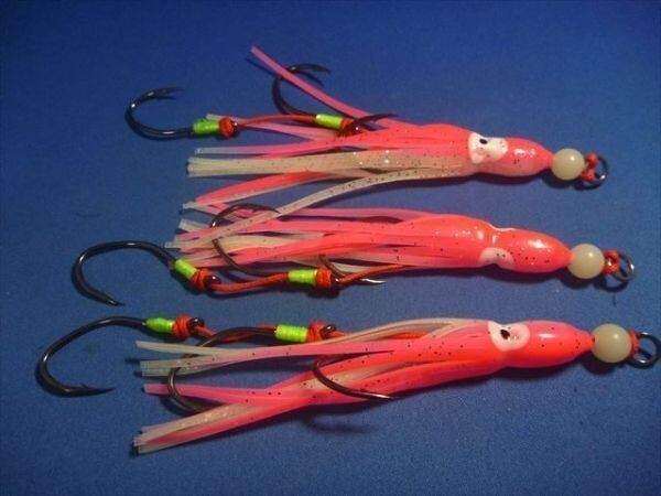 - バラシ激減・タコベイト3段フック赤白 3/0 3本セット、12㎝・鯛ラバ、根魚・サケ・アキアジ・紅鮭・切り身・マグロ・サンマ・サンマ