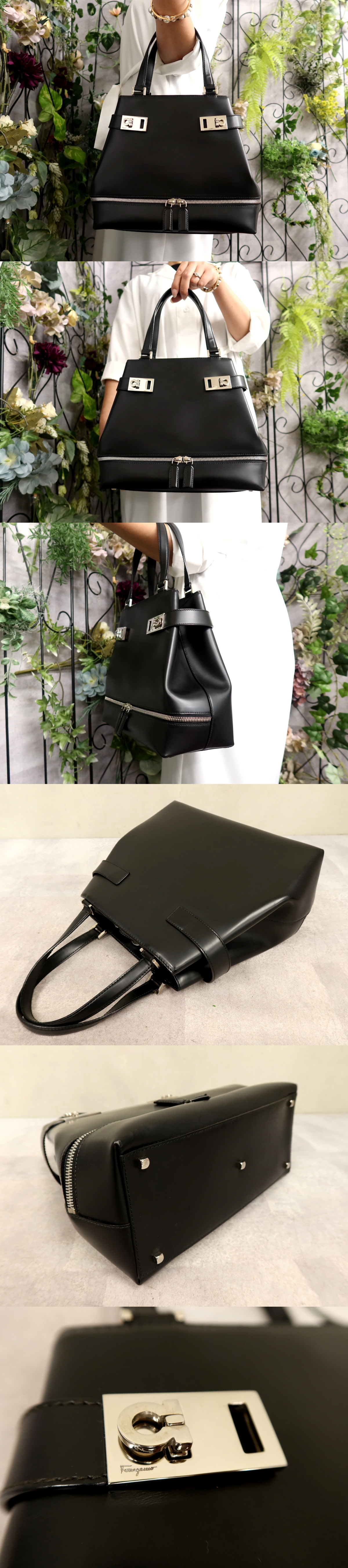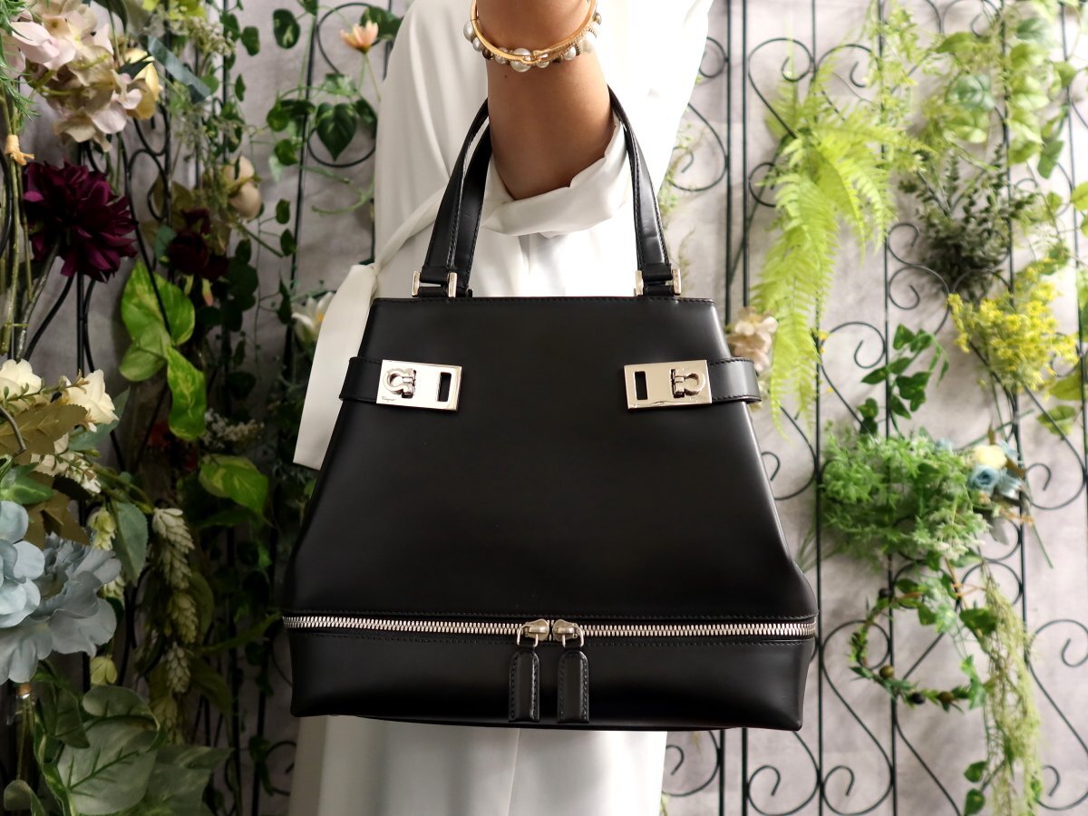 > ●超美品●Salvatore Ferragamo フェラガモ●ガンチーニ●カーフ レザー 本革●ハンド バッグ●黒●シルバー金具●腕掛け●かばん●Js60513