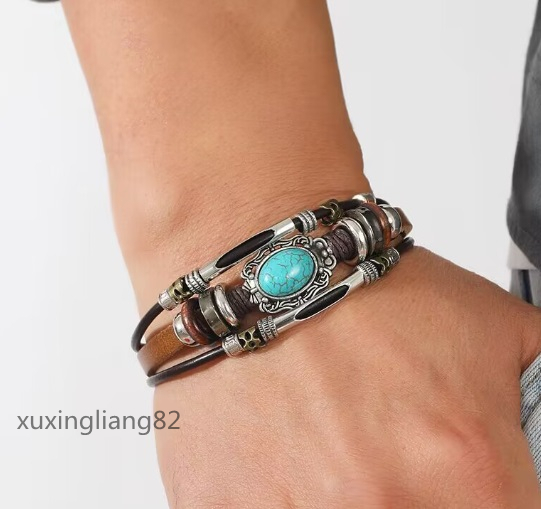 - 大粒緑松石 ブレスレット 新販売 本革 メンズ レザーバングル 紳士 アクセサリー 男女兼用 総長約21cm ブラウン