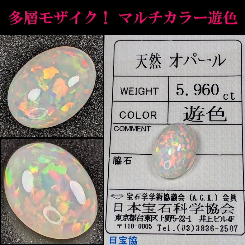 > ◆動画有★多層モザイクマルチカラー遊色◆鑑定済★5.960Ct★天然オパール◆ハーレクイン風 希少ルース◆エチオピア産/opal/指輪ペンダント