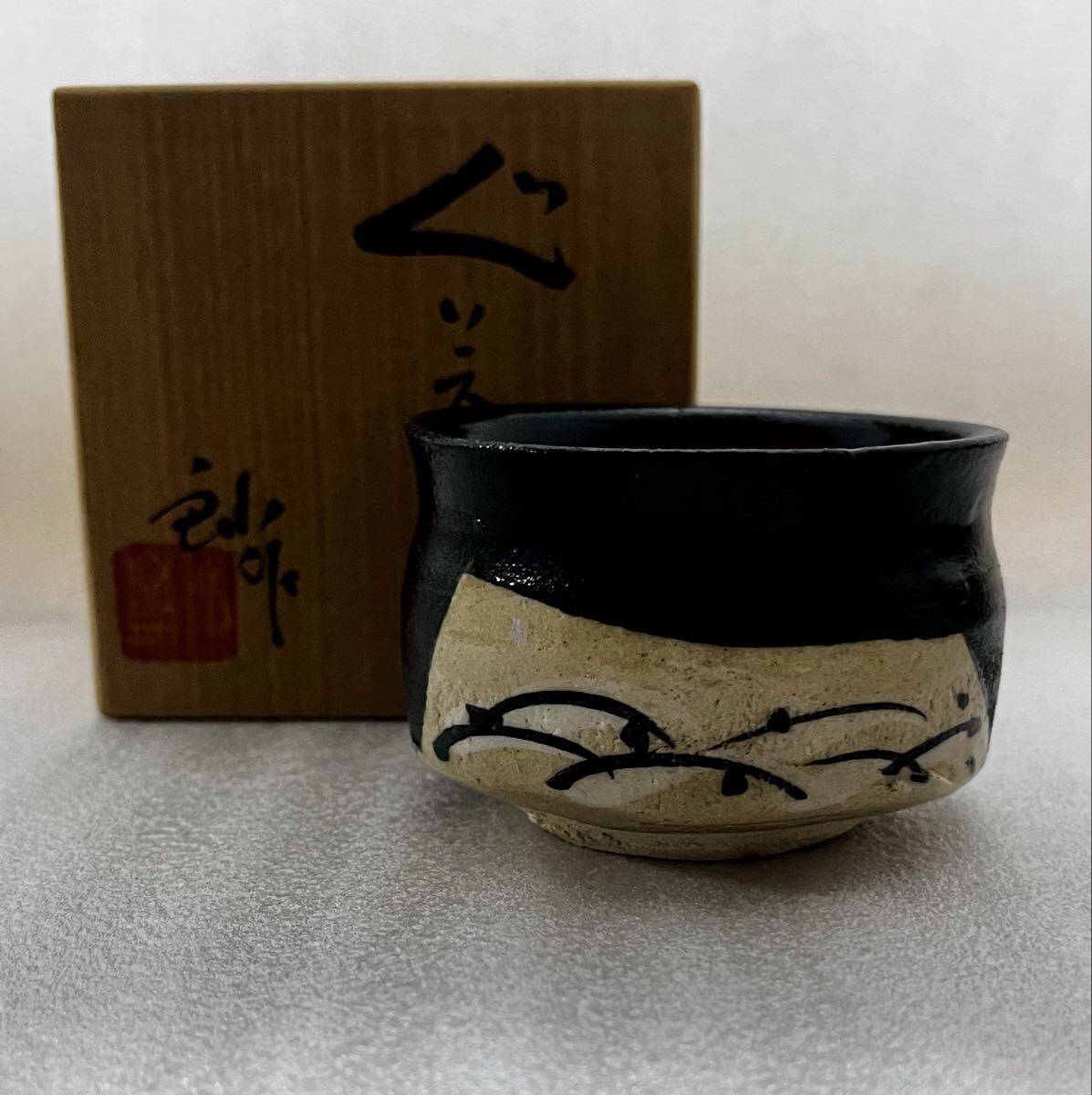 - 希少 骨董 瀬戸焼 黒織部 背戸窯 加藤鈔 ぐい呑 盃 酒盃 陶芸 有名作家 共箱 瀬戸 赤津