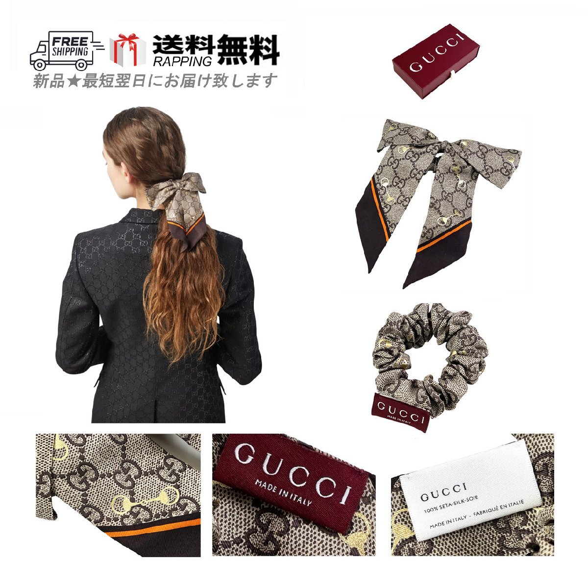 - L828.. GUCCI グッチ ヘアアクセサリー シュシュ リボン レディース セット シルク 100% スプリーム GG ロゴ イタリア製 ★ 2276 ブラウン