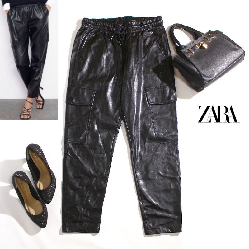 > 美品 ZARA ザラ 秋 冬 合皮レザーパンツ M ブラック 黒 レザーパンツ パンツ 合皮レザー レザー ウエストゴム ベルト入り 厚手 柔らか