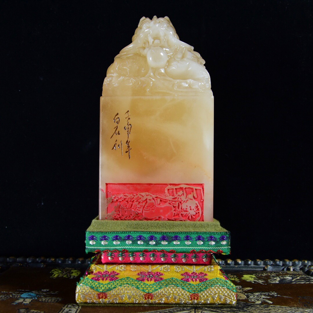 - 蔵友旧蔵出 寿山石 白田黄石 細密彫 神獣戲珠 印章 盒付 文房具 文案置物 書道品 稀少物品 置物 賞物 中国時代美術品